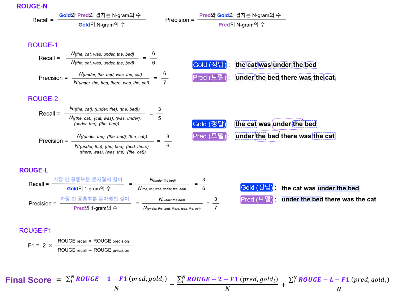 - 모델이 생성한 요약본(+번역, …)과 사람이 만든 참조 요약본을 비교하여 점수 계산