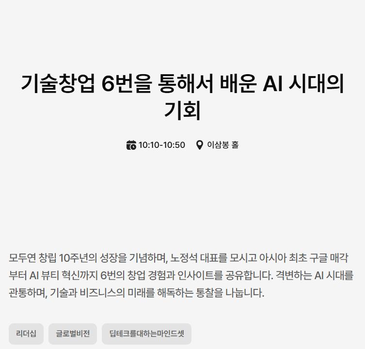 일단 본인은 창업, AI 교육에 관심 많은 사람인데 아래의 선택된 세션들을 보면 그 관심을 엿볼 수 있을 것이다. 그러나 위에서 말했다시피 컨디션 이슈로 오후 늦게 가서 실제로는 마지막 5, 6번째 세션만 봤다. 불행 중 다행인 게 모두콘은 세션 다시 보기를 유튜브로 제공해 줘서 좋다. 아직까지 다시 보진 않았지만 유튜브에서 나중에 찾아보려고 해당 영상 북마크 해놨다.